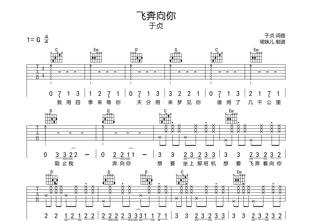 于贞《飞奔向你》吉他谱 - G调弹唱六线谱