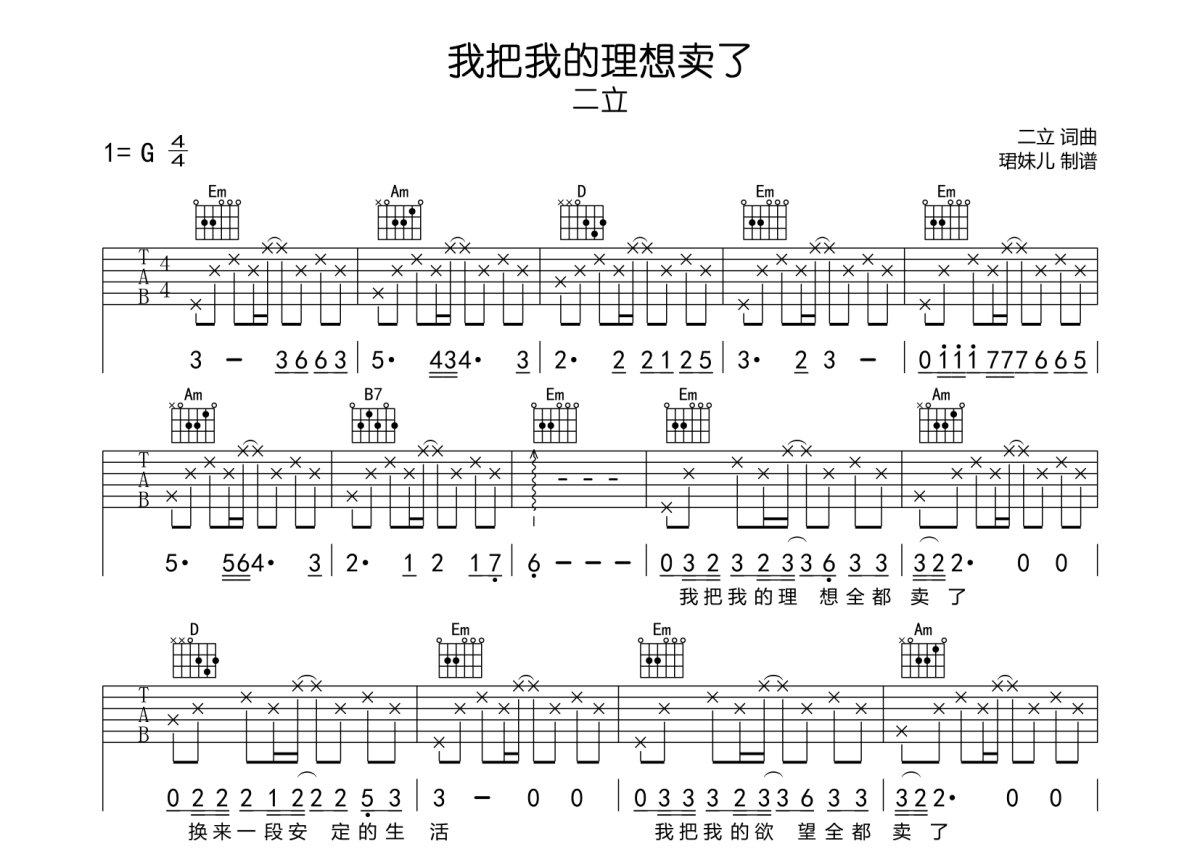 二立《我把我的理想卖了》吉他谱 - G调弹唱六线谱