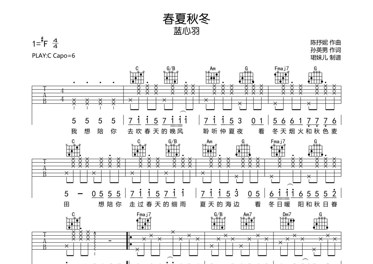 蓝心羽《春夏秋冬》吉他谱 - C调弹唱六线谱