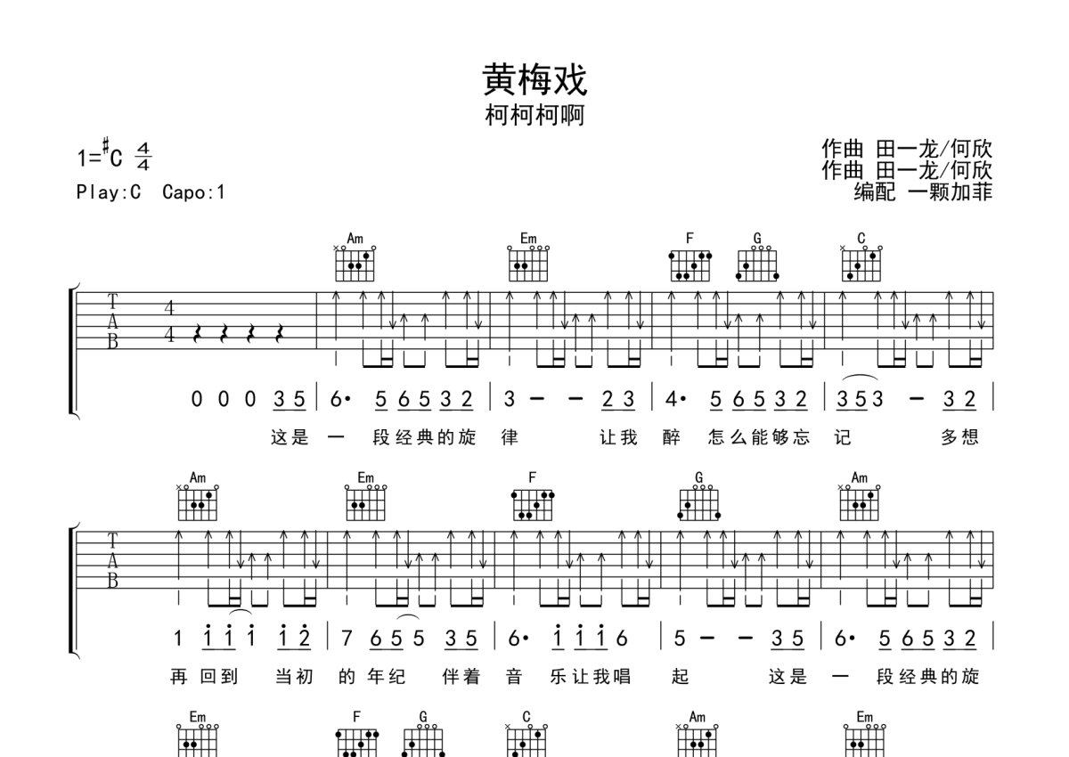 柯柯柯啊《黄梅戏》吉他谱 - C调弹唱六线谱 - 完整编配版