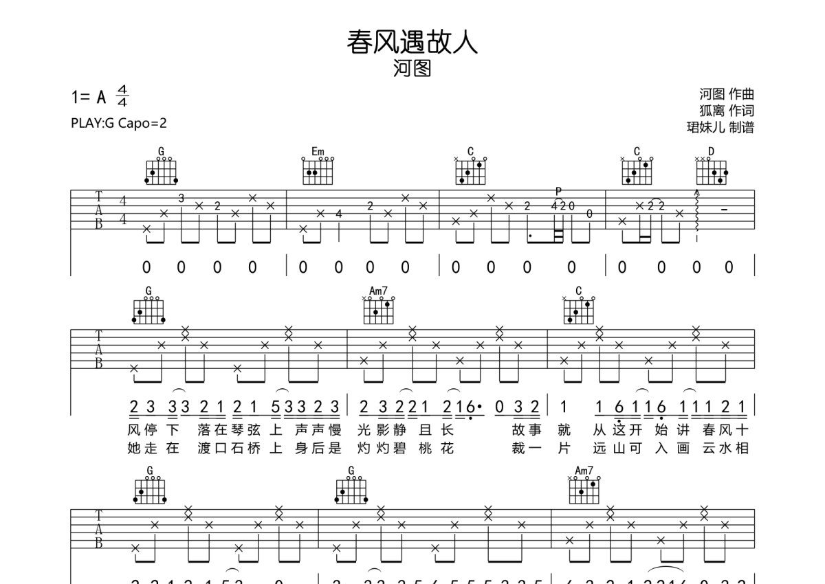 河图《春风遇故人》吉他谱 - G调弹唱六线谱