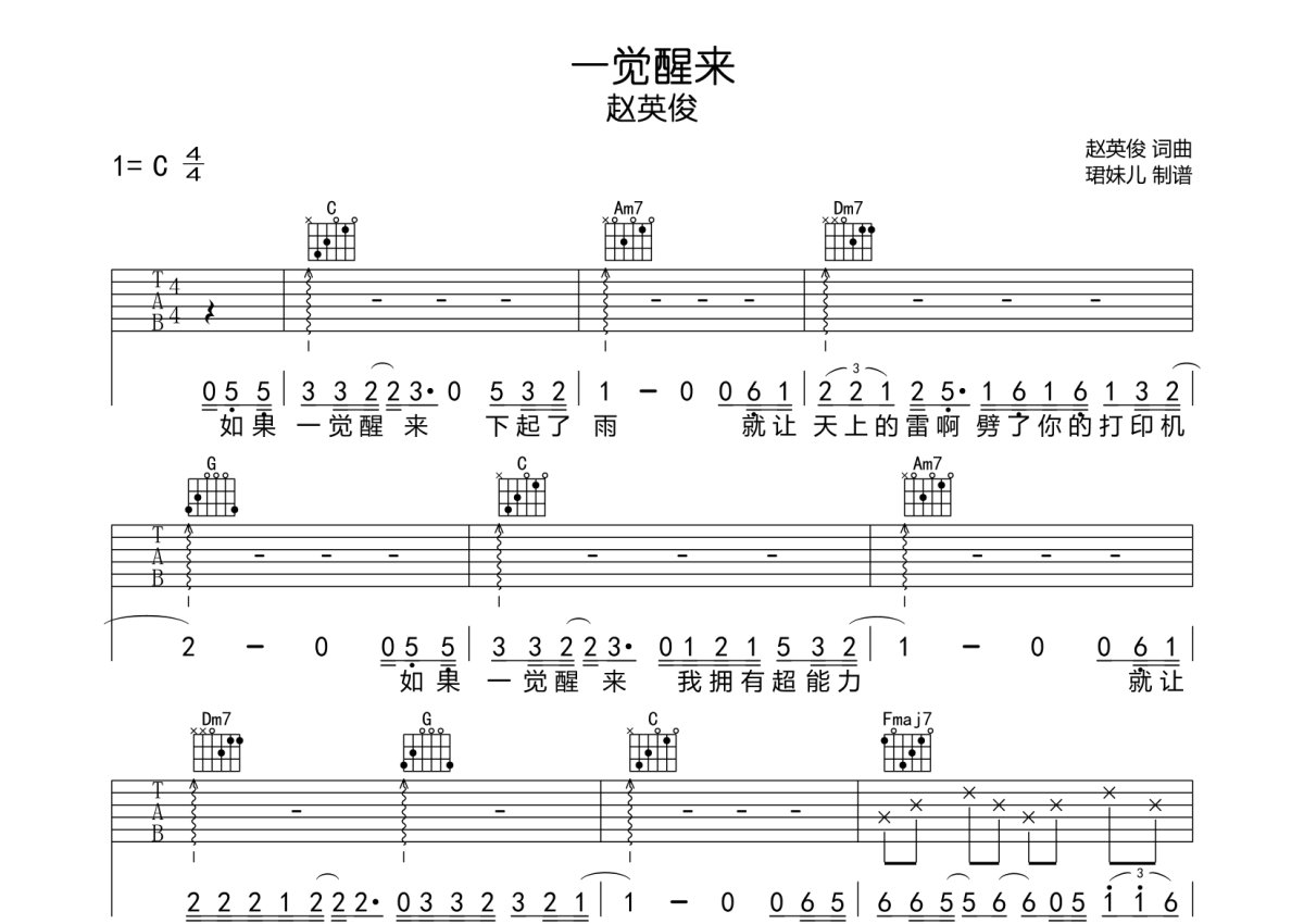 赵英俊《一觉醒来》吉他谱 - C调弹唱六线谱