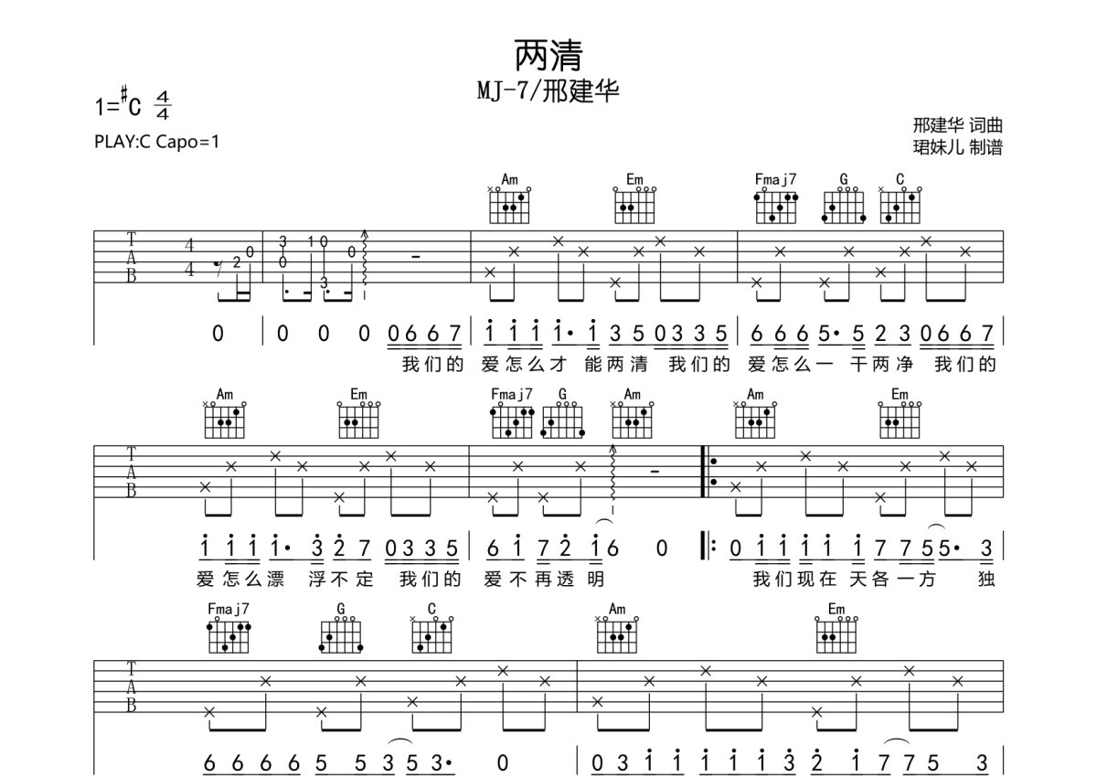 MJ-7/邢建华《两清》吉他谱 - C调弹唱六线谱