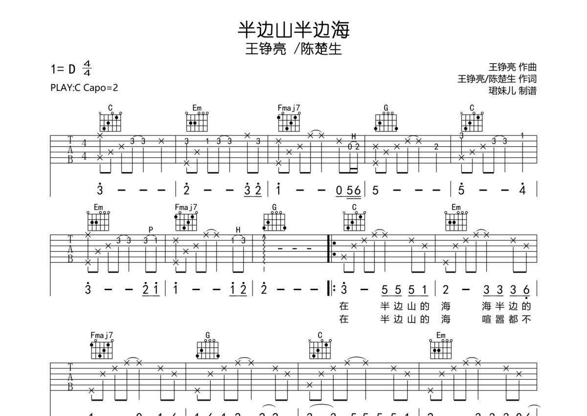 《半边山半边海》是王铮亮/陈楚生演唱的一首歌曲,本吉他谱采用的是C调指法编配,这份吉他谱共有三张高清图谱,图谱由 @珺妹儿 编配上传,图谱使用六线谱编配,包含吉他和弦指法、简谱以及歌词部分,使用这份半边山半边海吉他谱,可以让你更加方便地掌握这首歌曲的弹唱技巧,快来尝试吧。谱采用C调指法编配,弹唱建议变调夹2品,速度85BPM难度较简单,易上手。