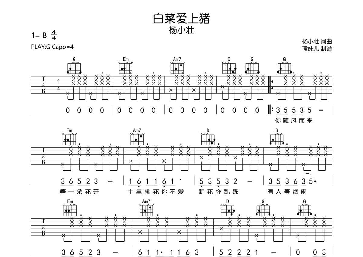 杨小壮《白菜爱上猪》吉他谱 - G调弹唱六线谱