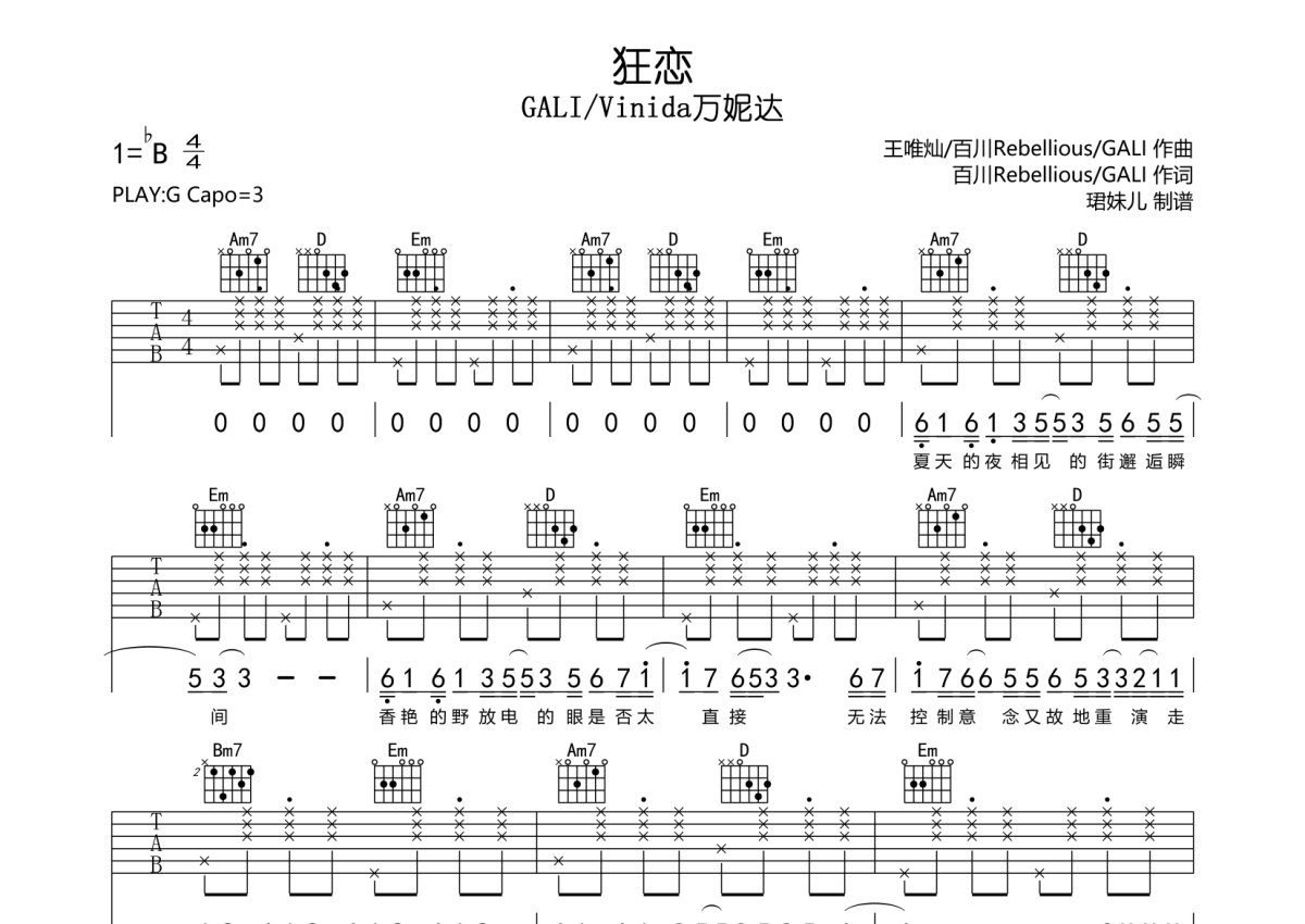 GALI/Vinida万妮达《狂恋》吉他谱 - G调弹唱六线谱