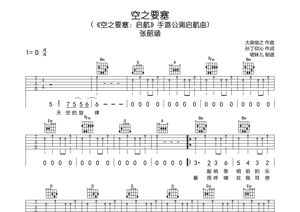 《空之要塞》是张韶涵演唱的一首歌曲,本吉他谱采用的是D调指法编配,这份吉他谱共有三张高清图谱,图谱由 @珺妹儿 编配上传,图谱使用六线谱编配,包含吉他和弦指法、简谱以及歌词部分,使用这份空之要塞吉他谱,可以让你更加方便地掌握这首歌曲的弹唱技巧,快来尝试吧。谱采用D调指法编配,速度85BPM难度较简单,易上手。