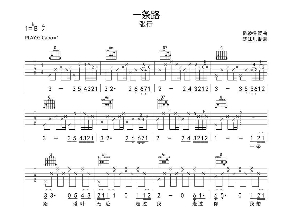 张行《一条路》吉他谱 - G调弹唱六线谱