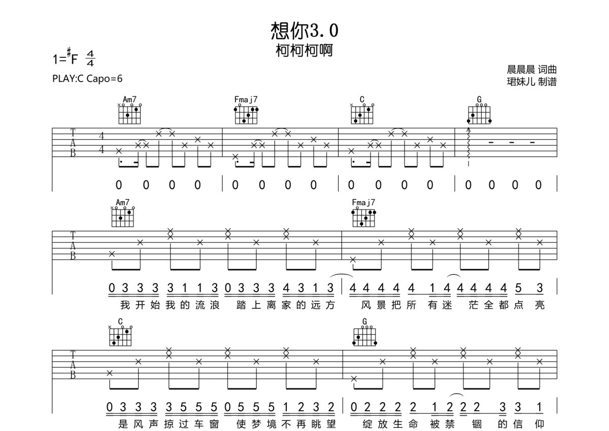 柯柯柯啊《想你3.0》吉他谱 - C调弹唱六线谱