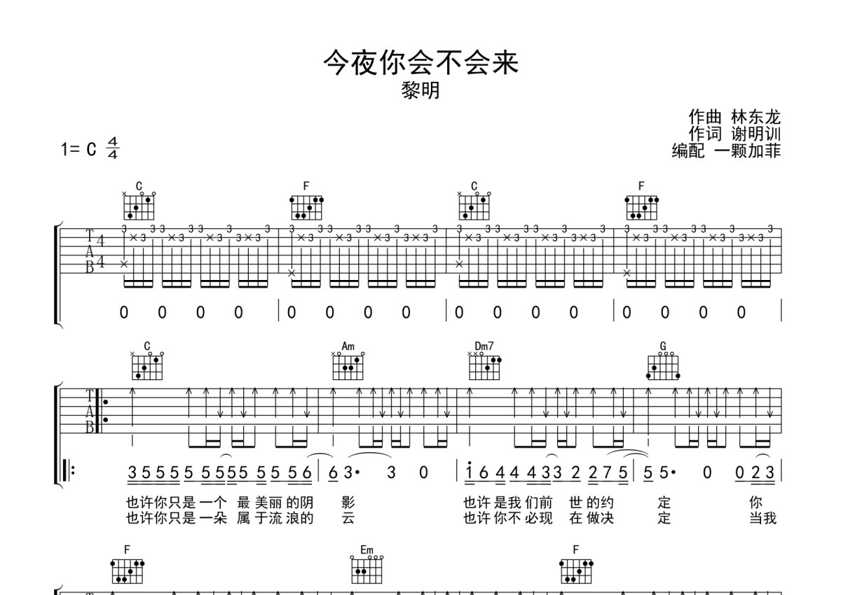 黎明《今夜你会不会来》吉他谱 - C调弹唱六线谱 - 完整编配版