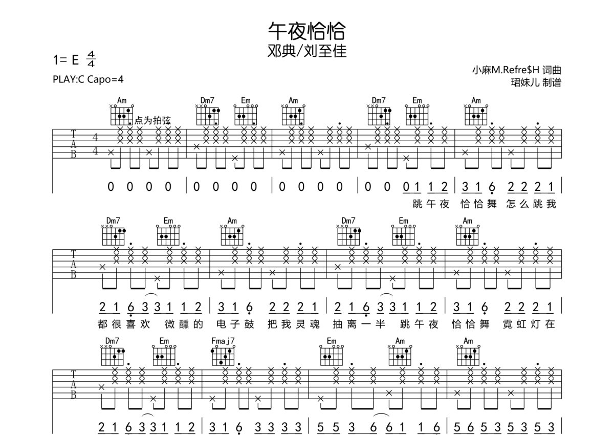 邓典/刘至佳《午夜恰恰》吉他谱 - C调弹唱六线谱