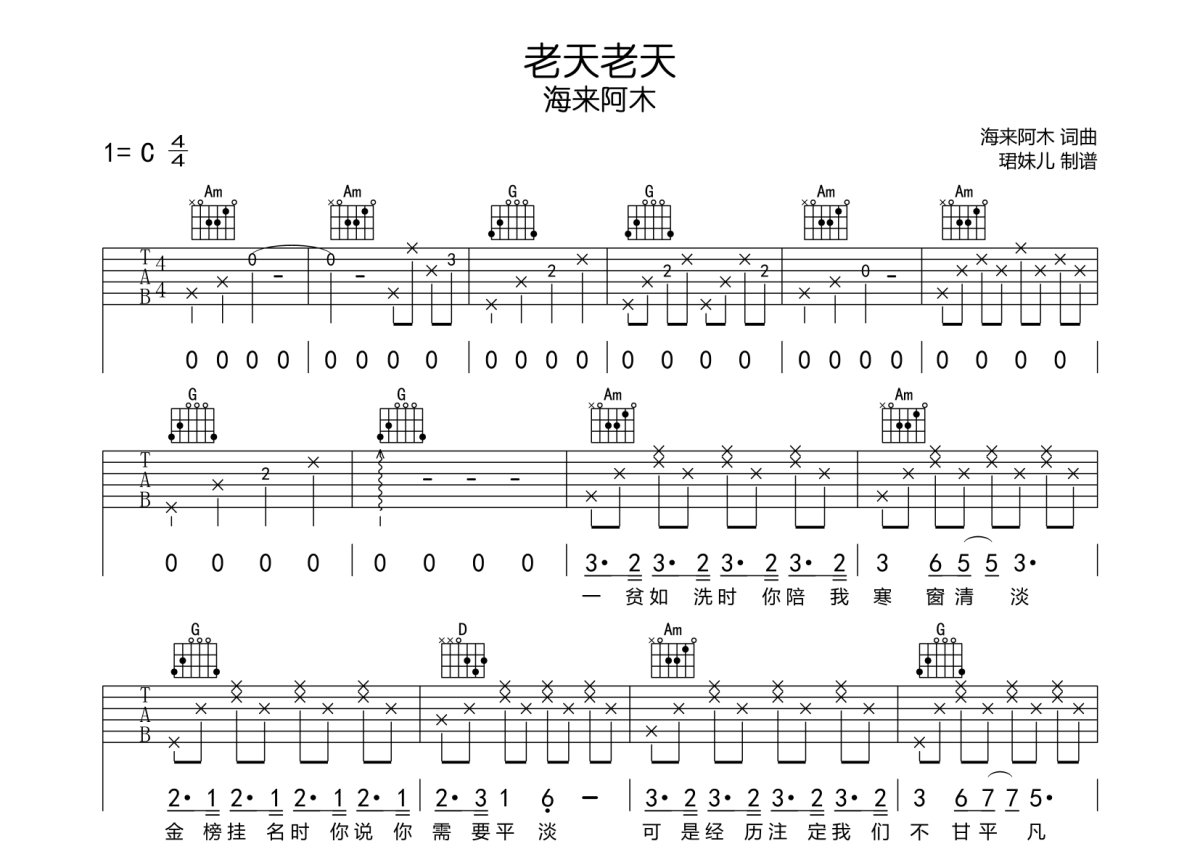 海来阿木《老天老天》吉他谱 - C调弹唱六线谱