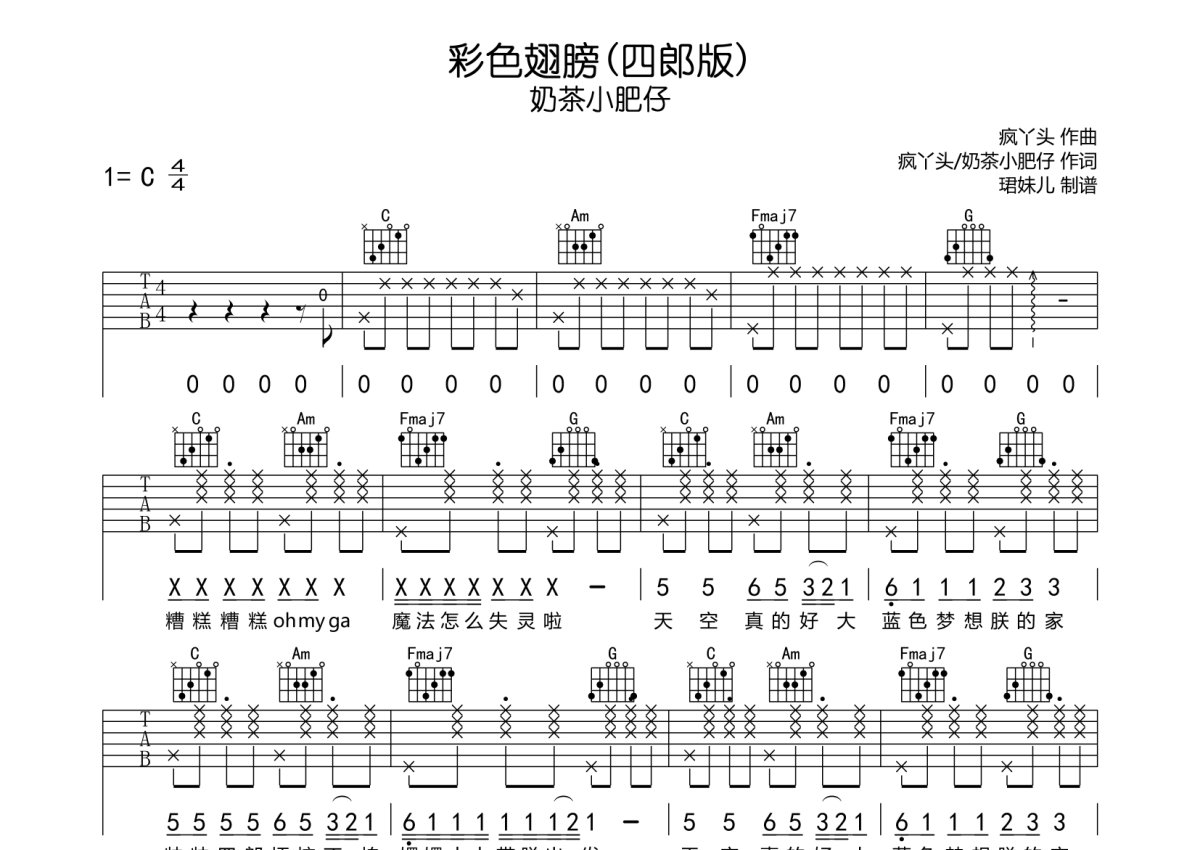 奶茶小肥仔《彩色翅膀 (四郎版)》吉他谱 - C调弹唱六线谱