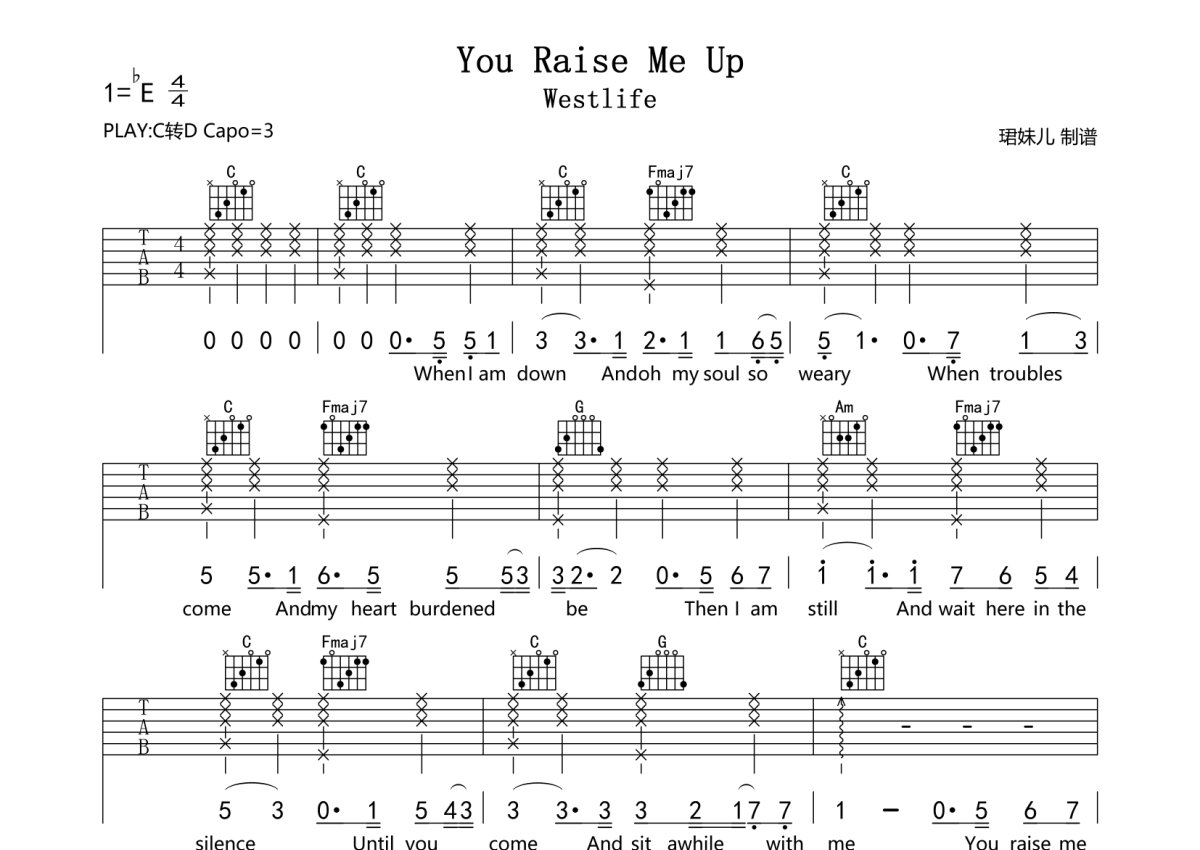 《You Raise Me Up》是Westlife演唱的一首歌曲,本吉他谱采用的是C调指法编配,这份吉他谱共有三张高清图谱,图谱由 @珺妹儿 编配上传,图谱使用六线谱编配,包含吉他和弦指法、简谱以及歌词部分,使用这份You Raise Me Up吉他谱,可以让你更加方便地掌握这首歌曲的弹唱技巧,快来尝试吧。谱采用C转D调指法编配,弹唱建议变调夹3品,速度85BPM难度较简单,易上手。