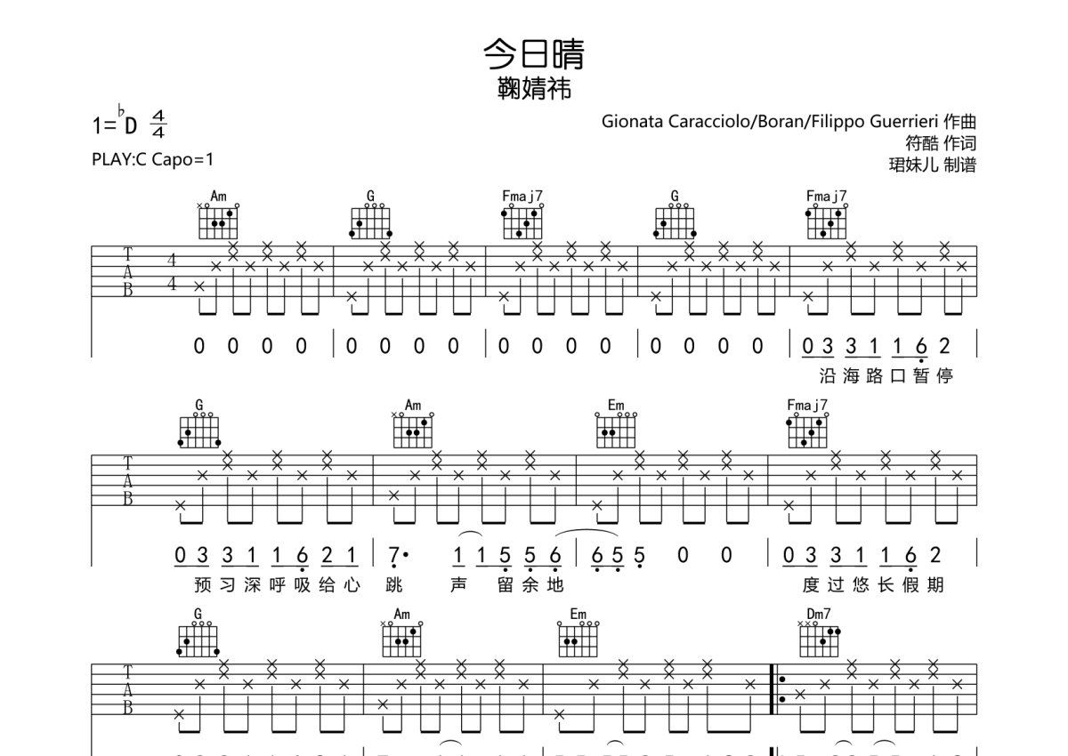 《今日晴》是鞠婧祎演唱的一首歌曲,本吉他谱采用的是C调指法编配,这份吉他谱共有四张高清图谱,图谱由 @珺妹儿 编配上传,图谱使用六线谱编配,包含吉他和弦指法、简谱以及歌词部分,使用这份今日晴吉他谱,可以让你更加方便地掌握这首歌曲的弹唱技巧,快来尝试吧。谱采用C调指法编配,弹唱建议变调夹1品,速度100BPM难度较简单,易上手。