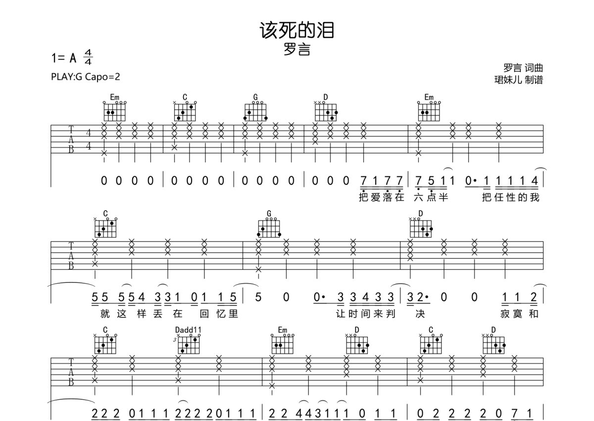 罗言《该死的泪》吉他谱 - G调弹唱六线谱