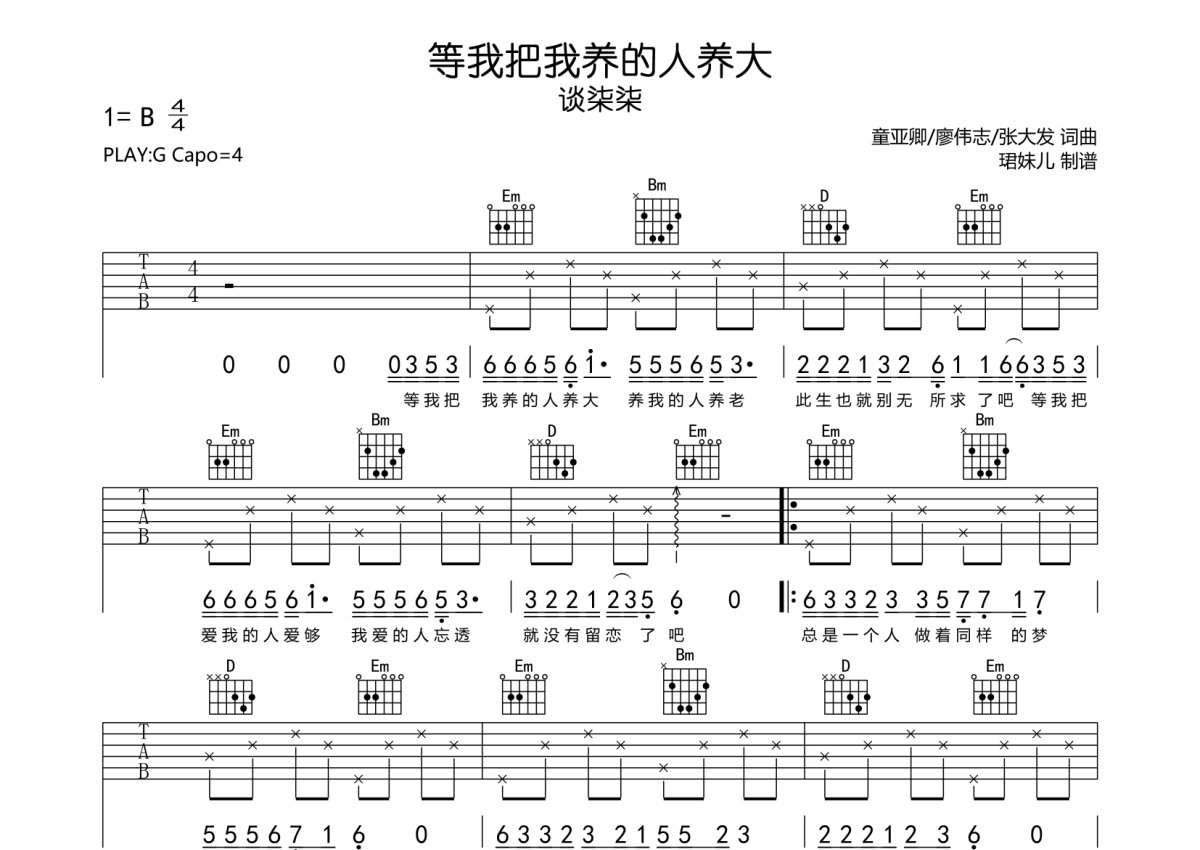 《等我把我养的人养大》是谈柒柒演唱的一首歌曲,本吉他谱采用的是G调指法编配,这份吉他谱共有两张高清图谱,图谱由 @珺妹儿 编配上传,图谱使用六线谱编配,包含吉他和弦指法、简谱以及歌词部分,使用这份等我把我养的人养大吉他谱,可以让你更加方便地掌握这首歌曲的弹唱技巧,快来尝试吧。谱采用G调指法编配,弹唱建议变调夹4品,速度85BPM难度较简单,易上手。