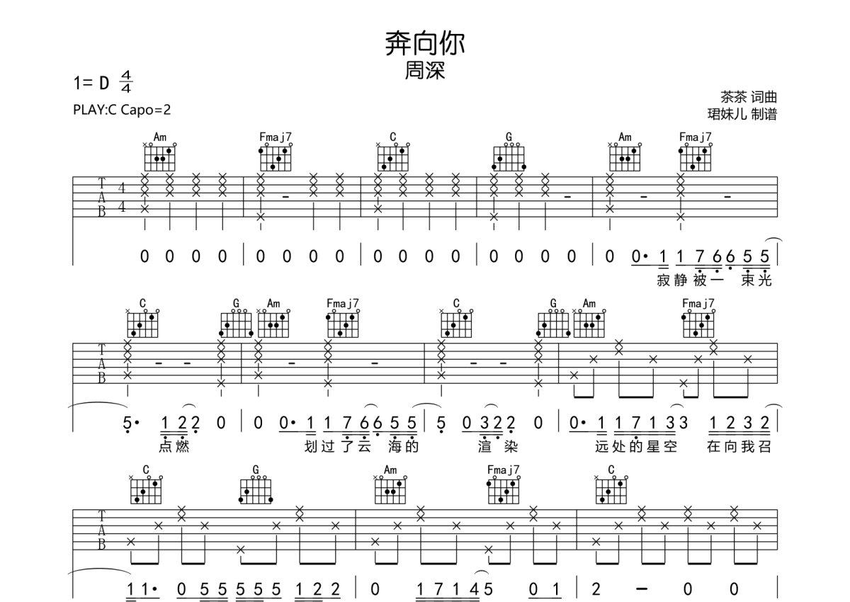 周深《奔向你》吉他谱 - C调弹唱六线谱