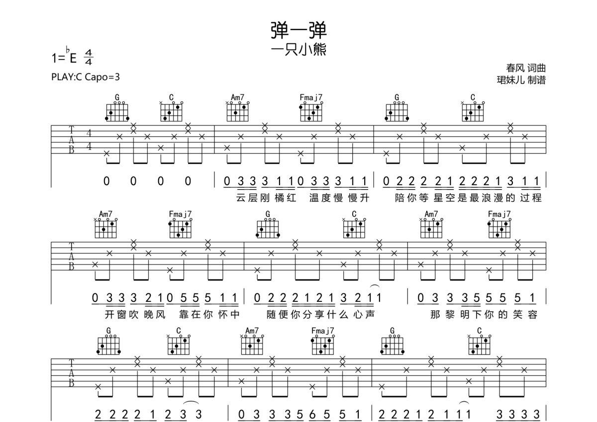 《弹一弹》是一只小熊演唱的一首歌曲,本吉他谱采用的是C调指法编配,这份吉他谱共有两张高清图谱,图谱由 @珺妹儿 编配上传,图谱使用六线谱编配,包含吉他和弦指法、简谱以及歌词部分,使用这份弹一弹吉他谱,可以让你更加方便地掌握这首歌曲的弹唱技巧,快来尝试吧。谱采用C调指法编配,,弹唱建议变调夹3品,速度85BPM难度较简单,易上手。