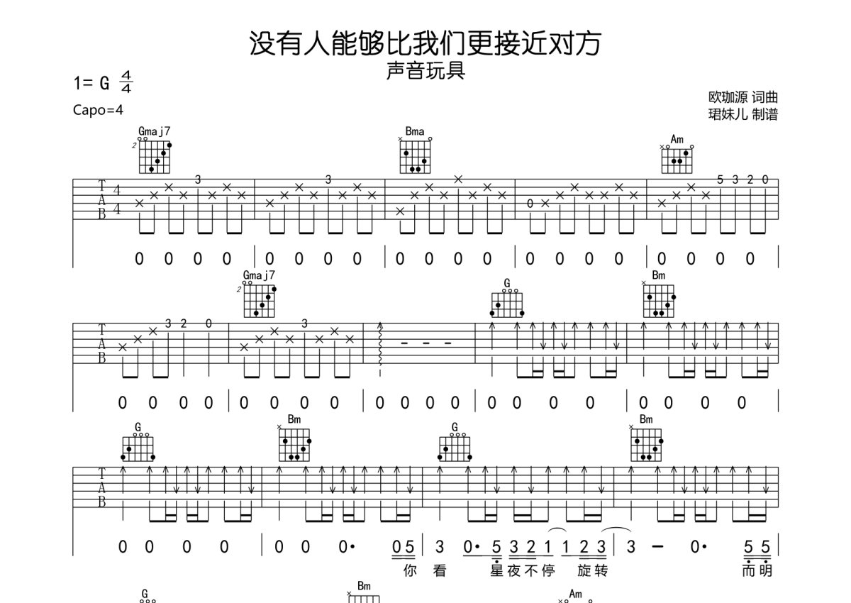 《没有人能够比我们更接近对方》是声音玩具演唱的一首歌曲,本吉他谱采用的是G调指法编配,这份吉他谱共有三张高清图谱,图谱由 @珺妹儿 编配上传,图谱使用六线谱编配,包含吉他和弦指法、简谱以及歌词部分,使用这份没有人能够比我们更接近对方吉他谱,可以让你更加方便地掌握这首歌曲的弹唱技巧,快来尝试吧。谱采用G调指法编配,弹唱建议变调夹2品,速度85BPM难度较简单,易上手。