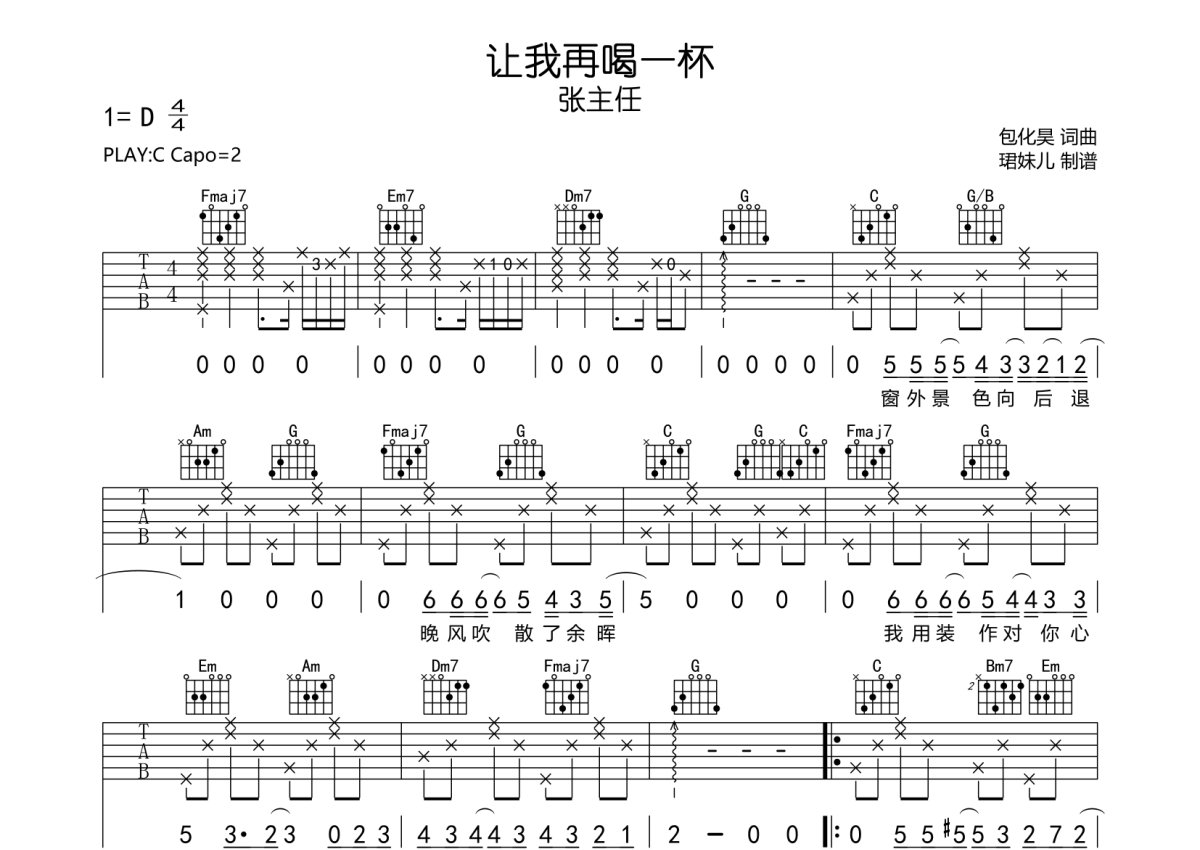 张主任《让我再喝一杯》吉他谱 - C调弹唱六线谱