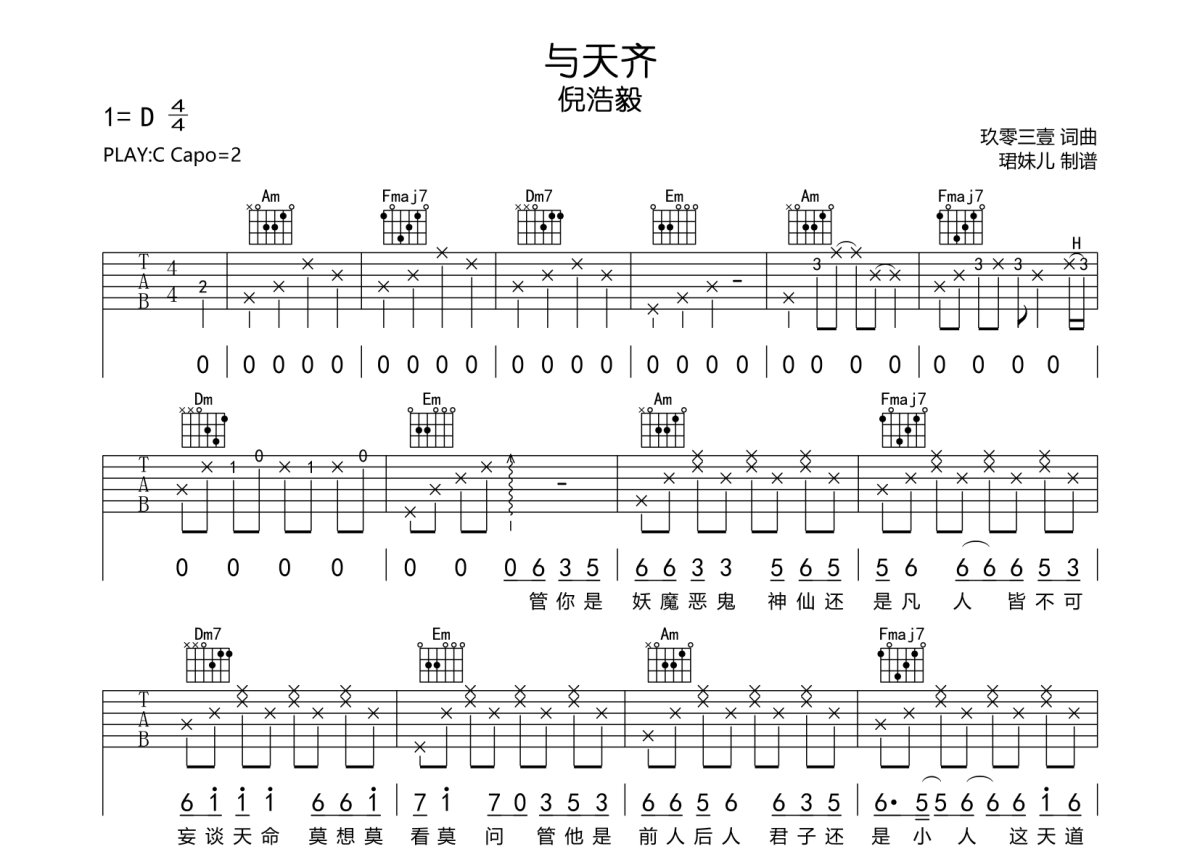 倪浩毅《与天齐》吉他谱 - C调弹唱六线谱