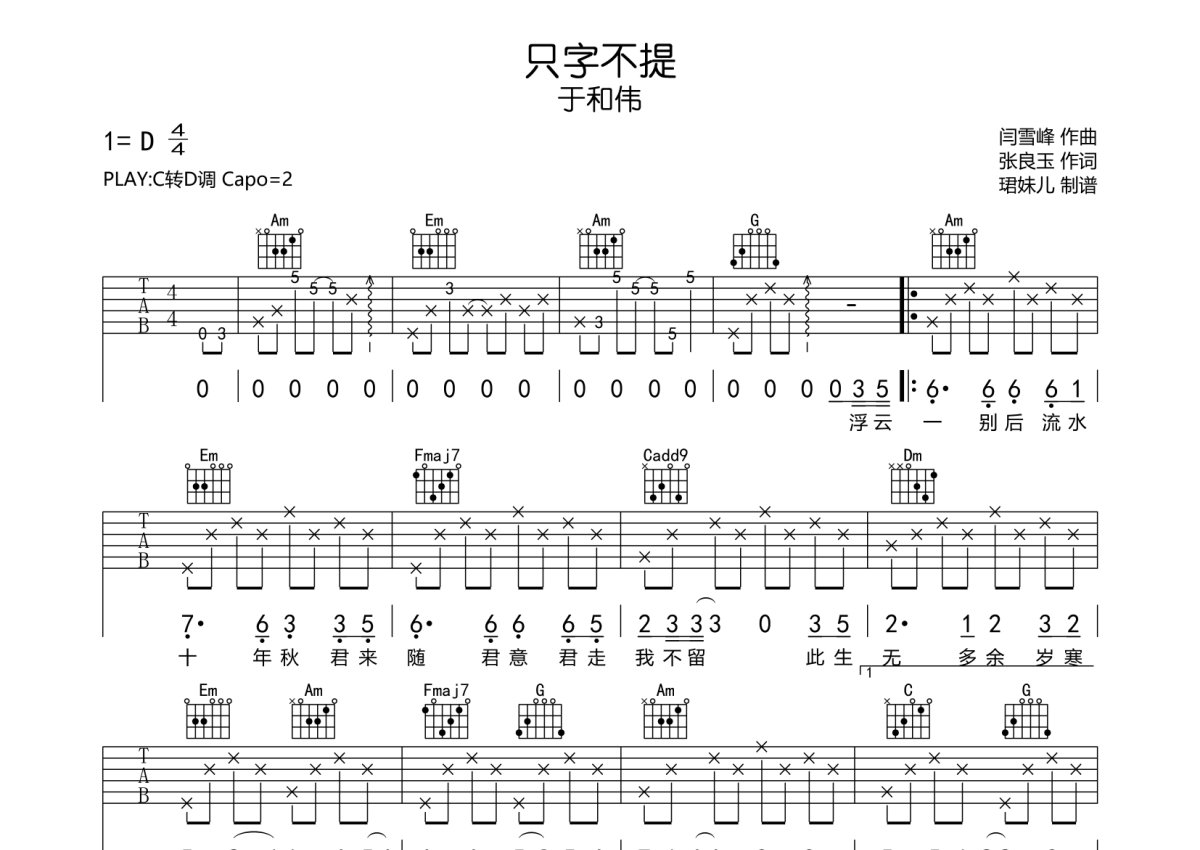 《只字不提》是于和伟演唱的一首歌曲,本吉他谱采用的是C调指法编配,这份吉他谱共有三张高清图谱,图谱由 @珺妹儿 编配上传,图谱使用六线谱编配,包含吉他和弦指法、简谱以及歌词部分,使用这份只字不提吉他谱,可以让你更加方便地掌握这首歌曲的弹唱技巧,快来尝试吧。谱采用C转D调指法编配,弹唱建议变调夹2品,速度85BPM难度较简单,易上手。