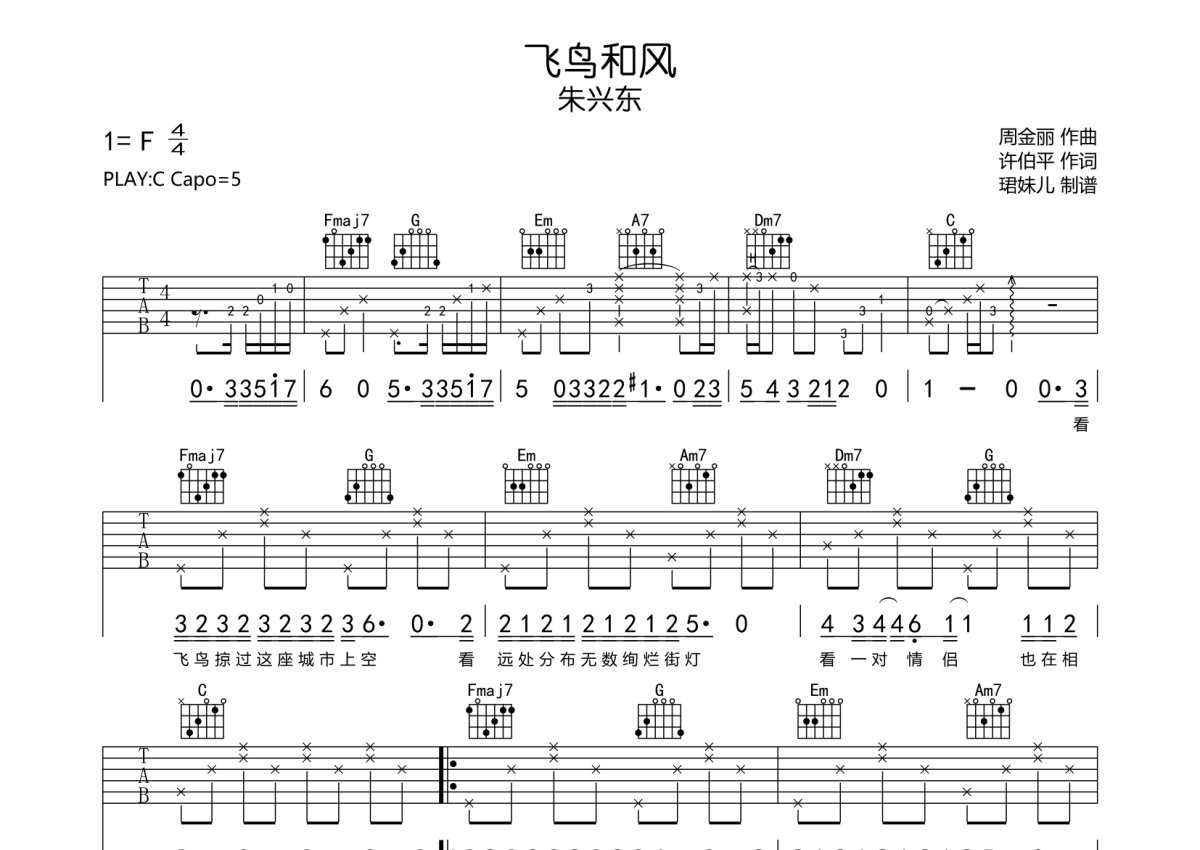 朱兴东《飞鸟和风》吉他谱 - C调弹唱六线谱