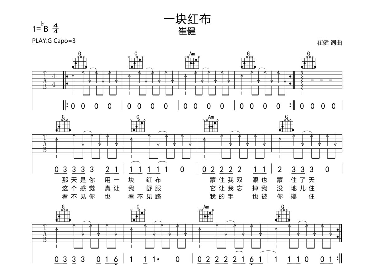 崔健《一块红布》吉他谱 - G调弹唱六线谱