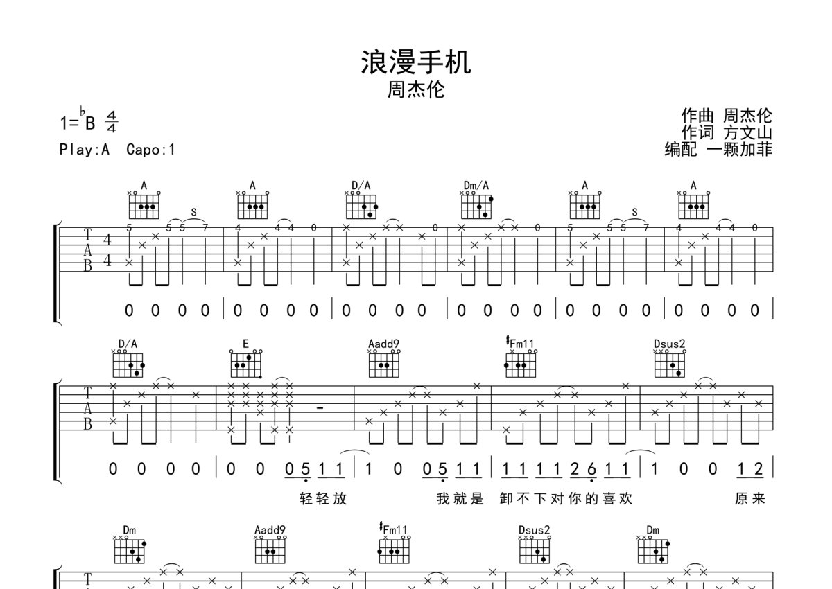 《浪漫手机》是周杰伦演唱的一首歌曲,完整编配版,本吉他谱采用的是A调指法编配,这份吉他谱共有三张高清图谱,图谱由 @一颗加菲 编配上传,图谱使用六线谱编配,包含吉他和弦指法、简谱以及歌词部分,曲谱配备了相关的音频提供试听,使用这份浪漫手机吉他谱,可以让你更加方便地掌握这首歌曲的弹唱技巧,快来尝试吧。