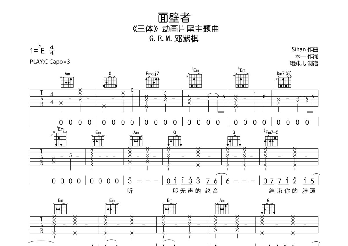《面壁者》是G.E.M.邓紫棋演唱的一首歌曲,本吉他谱采用的是C调指法编配,这份吉他谱共有三张高清图谱,图谱由 @珺妹儿 编配上传,图谱使用六线谱编配,包含吉他和弦指法、简谱以及歌词部分,使用这份面壁者吉他谱,可以让你更加方便地掌握这首歌曲的弹唱技巧,快来尝试吧。《三体》动画片尾主题曲,谱采用C调指法编配,弹唱建议变调夹3品,速度85BPM难度较简单,易上手。