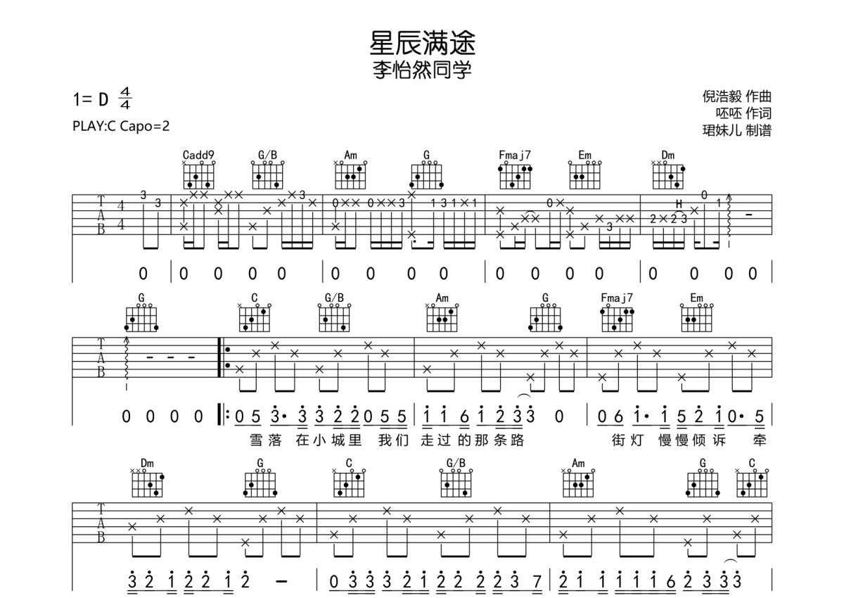 李怡然同学《星辰满途》吉他谱 - C调弹唱六线谱