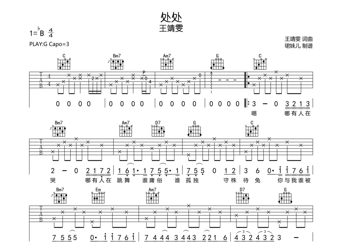 王靖雯《处处》吉他谱 - G调弹唱六线谱