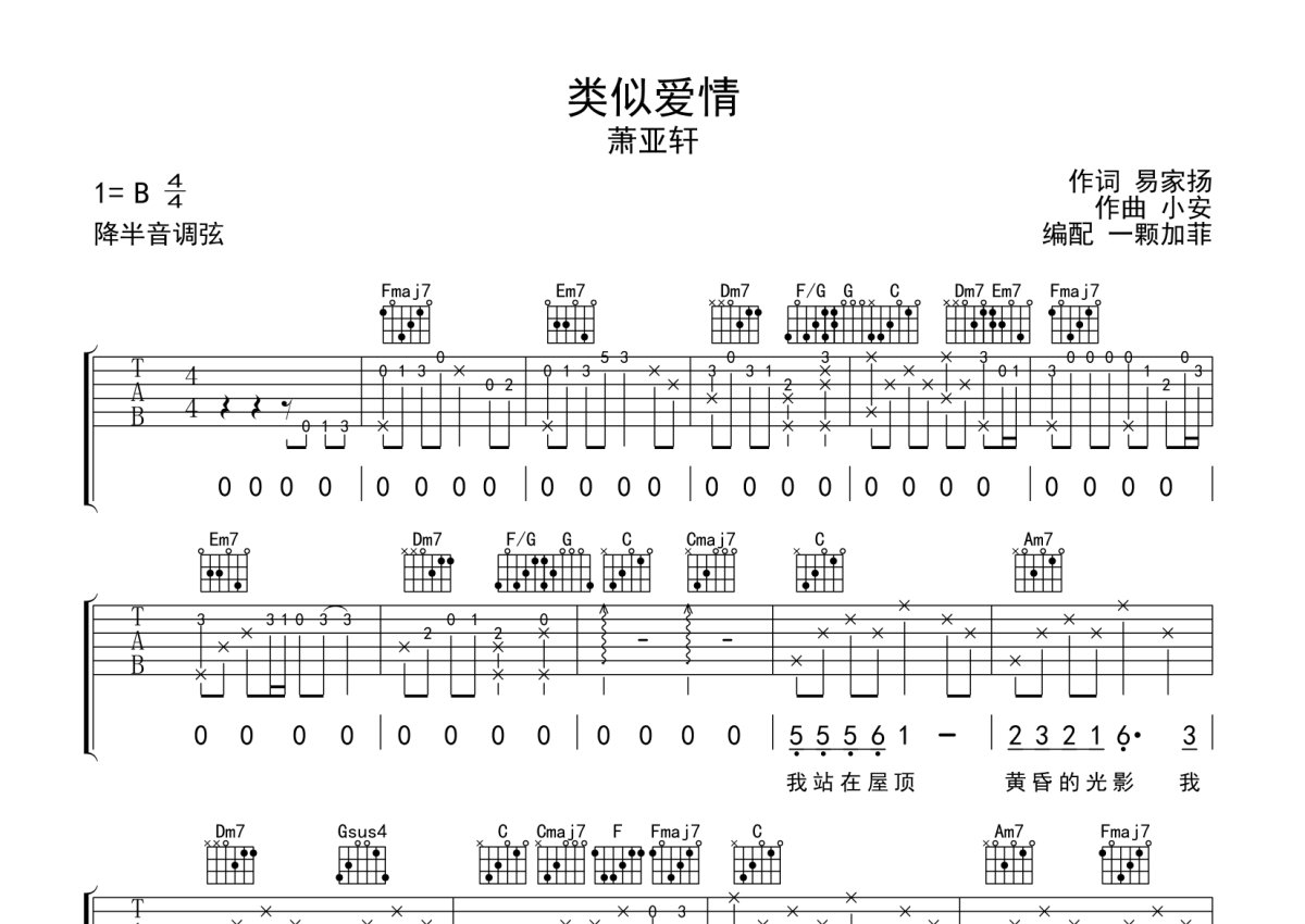 《类似爱情》是萧亚轩演唱的一首歌曲,完整编配版,本吉他谱采用的是C调指法编配,这份吉他谱共有三张高清图谱,图谱由 @一颗加菲 编配上传,图谱使用六线谱编配,包含吉他和弦指法、简谱以及歌词部分,曲谱配备了相关的音频提供试听,使用这份类似爱情吉他谱,可以让你更加方便地掌握这首歌曲的弹唱技巧,快来尝试吧。
