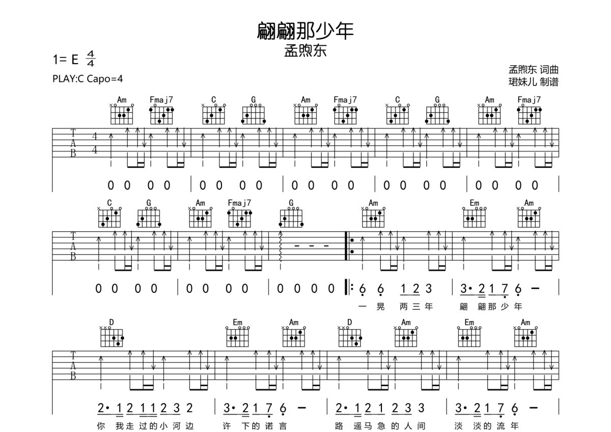 孟煦东《翩翩那少年》吉他谱 - C调弹唱六线谱