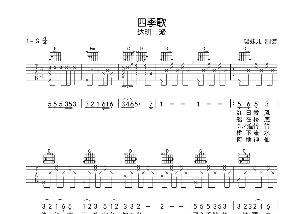 达明一派《四季歌》吉他谱 - G调弹唱六线谱