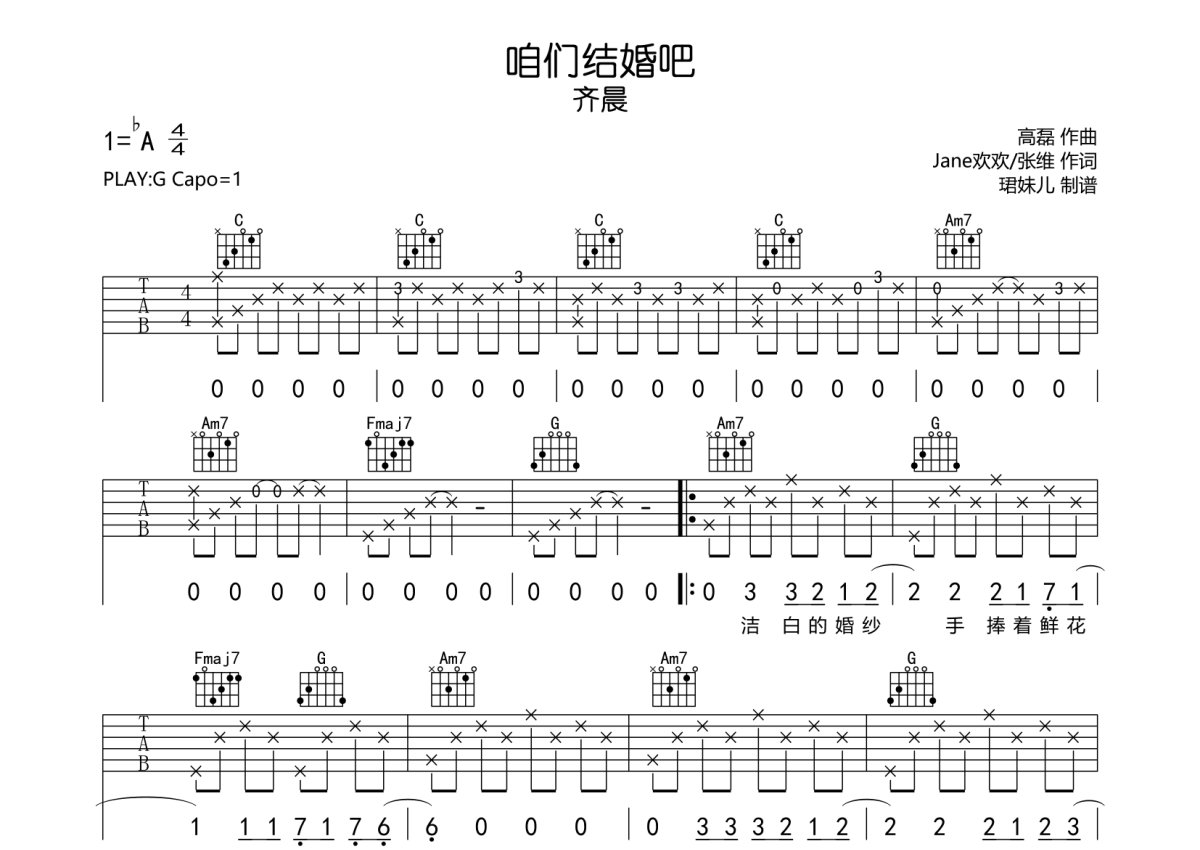 齐晨《咱们结婚吧》吉他谱 - G调弹唱六线谱