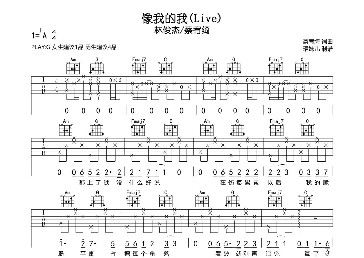 林俊杰/蔡宥绮《像我的我》吉他谱 - G调弹唱六线谱