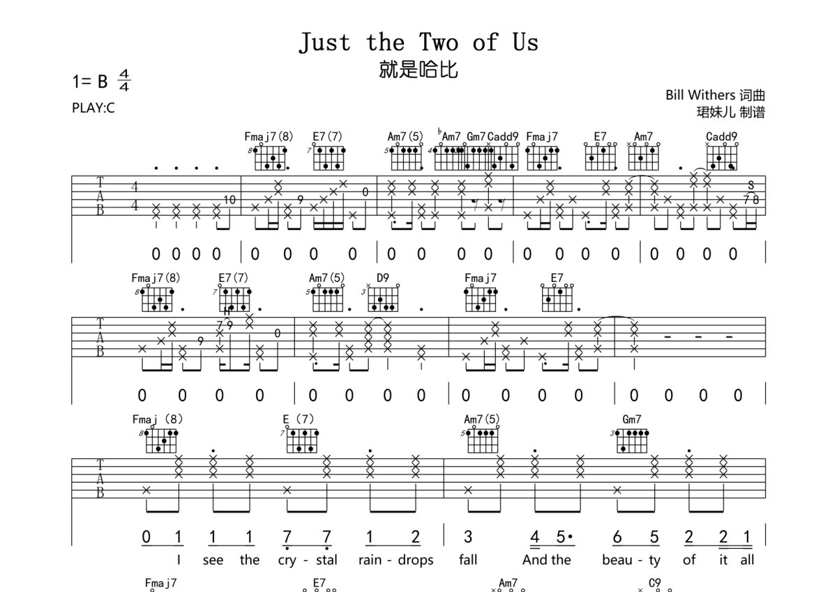 《Just the Two of Us》是就是哈比演唱的一首歌曲,本吉他谱采用的是C调指法编配,这份吉他谱共有三张高清图谱,图谱由 @珺妹儿 编配上传,图谱使用六线谱编配,包含吉他和弦指法、简谱以及歌词部分,使用这份Just the Two of Us吉他谱,可以让你更加方便地掌握这首歌曲的弹唱技巧,快来尝试吧。谱采用C调指法编配,速度85BPM难度较简单,易上手。