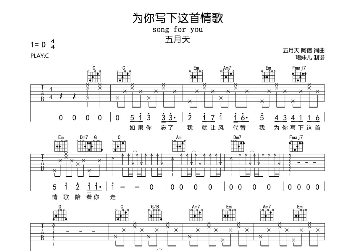 五月天《为你写下这首情歌》吉他谱 - C调弹唱六线谱