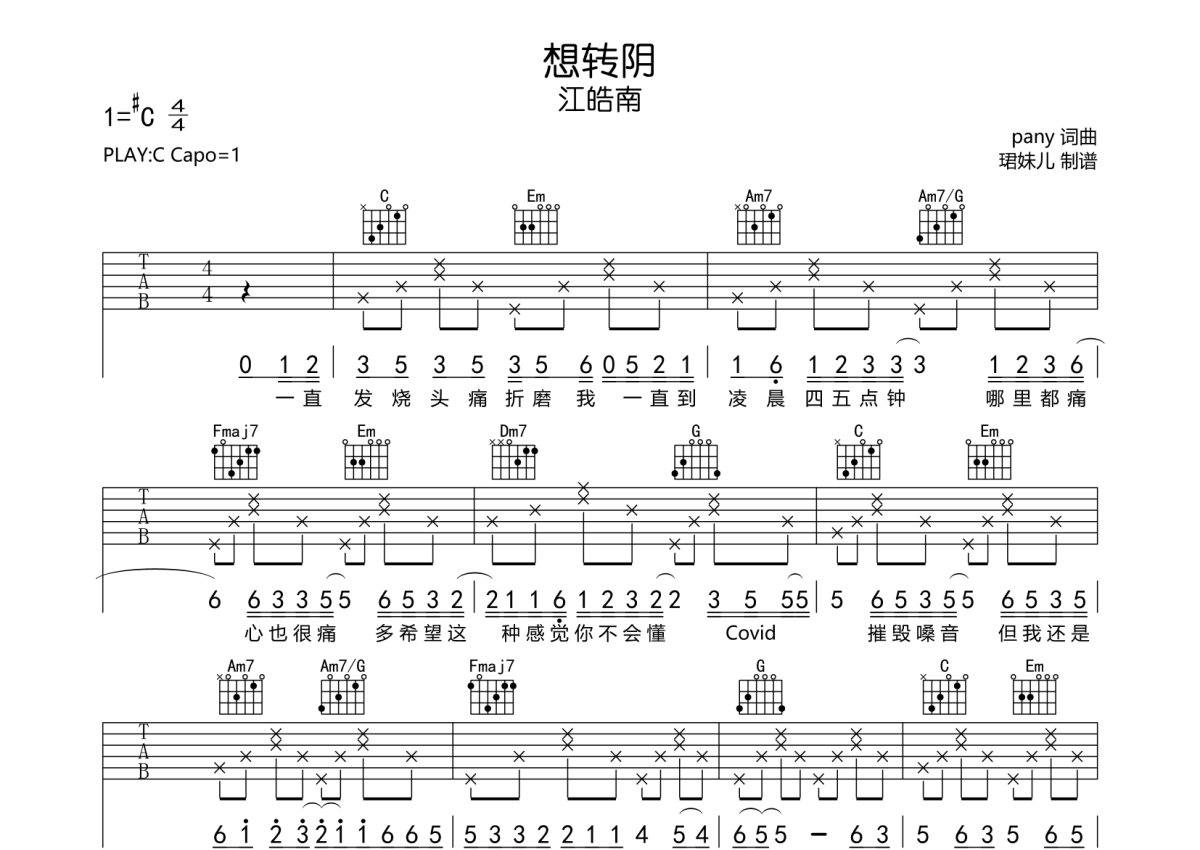 江皓南《想转阴》吉他谱 - C调弹唱六线谱