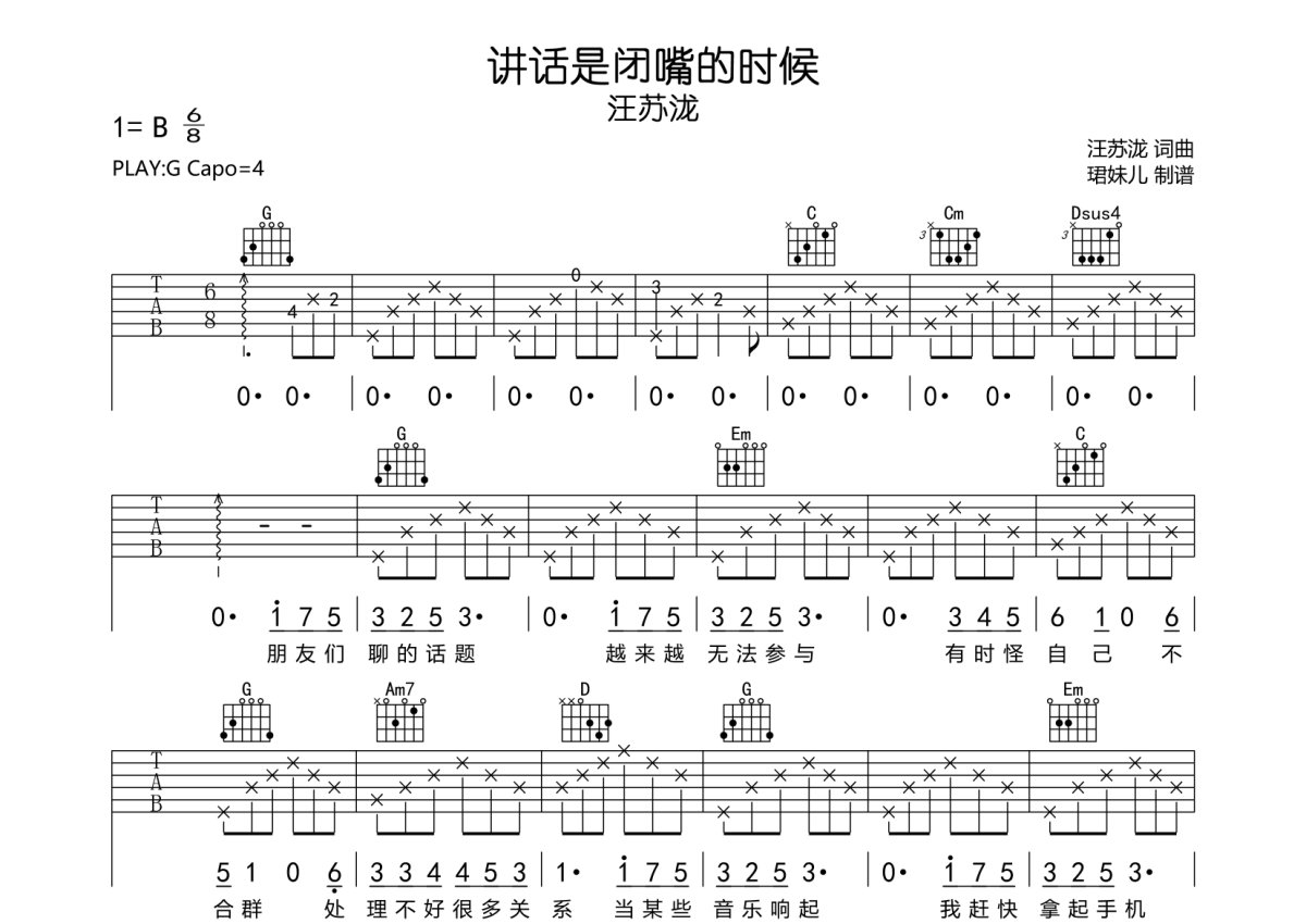 汪苏泷《讲话是闭嘴的时候》吉他谱 - G调弹唱六线谱