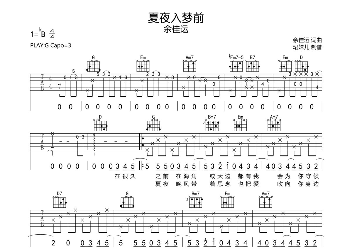 余佳运《夏夜入梦前》吉他谱 - G调弹唱六线谱