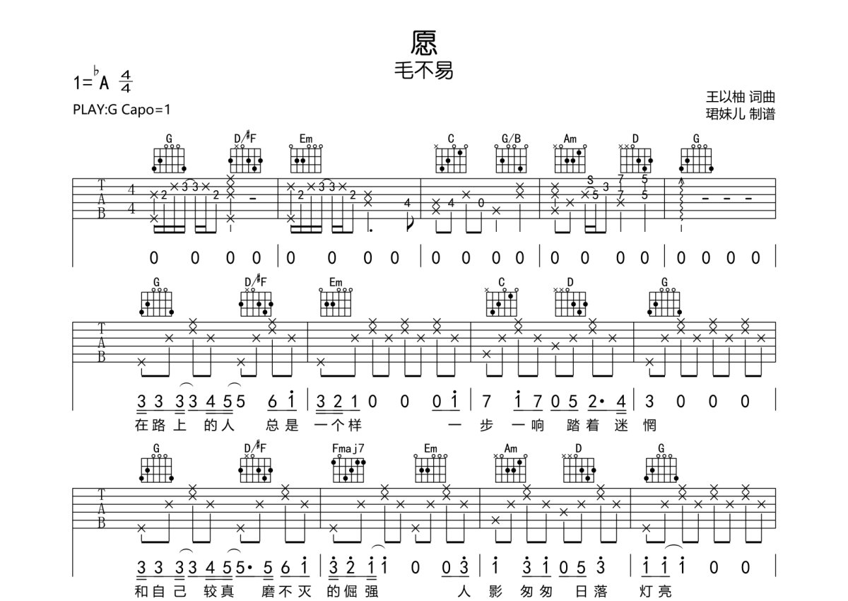 毛不易《愿》吉他谱 - G调弹唱六线谱