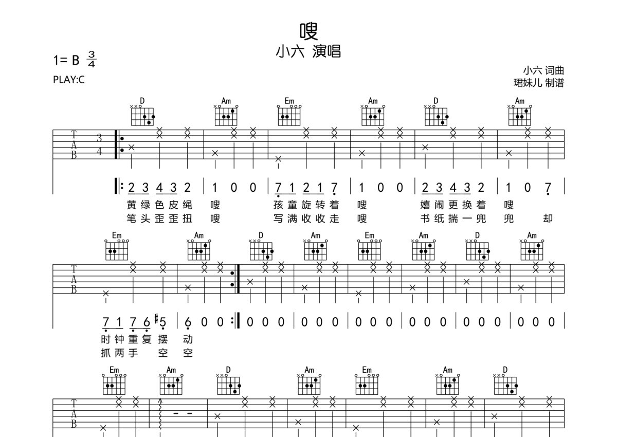 《嗖》是小六演唱的一首歌曲,本吉他谱采用的是C调指法编配,这份吉他谱共有三张高清图谱,图谱由 @珺妹儿 编配上传,图谱使用六线谱编配,包含吉他和弦指法、简谱以及歌词部分,使用这份嗖吉他谱,可以让你更加方便地掌握这首歌曲的弹唱技巧,快来尝试吧。谱采用C调指法编配,速度100BPM难度较简单,易上手。