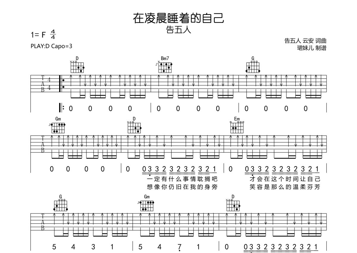 告五人《在凌晨睡着的自己》吉他谱 - D调弹唱六线谱