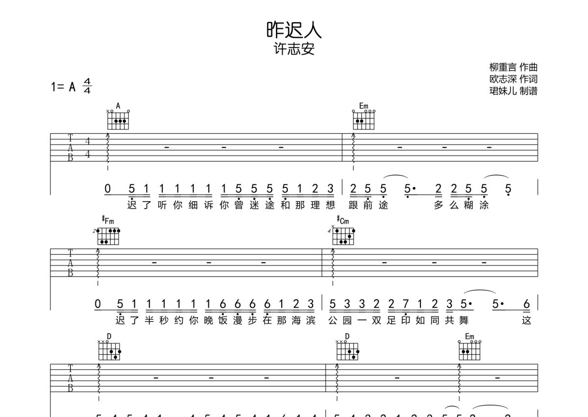 许志安《昨迟人》吉他谱 - A调弹唱六线谱