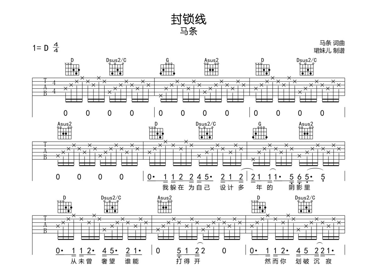 马条《封锁线》吉他谱 - D调弹唱六线谱