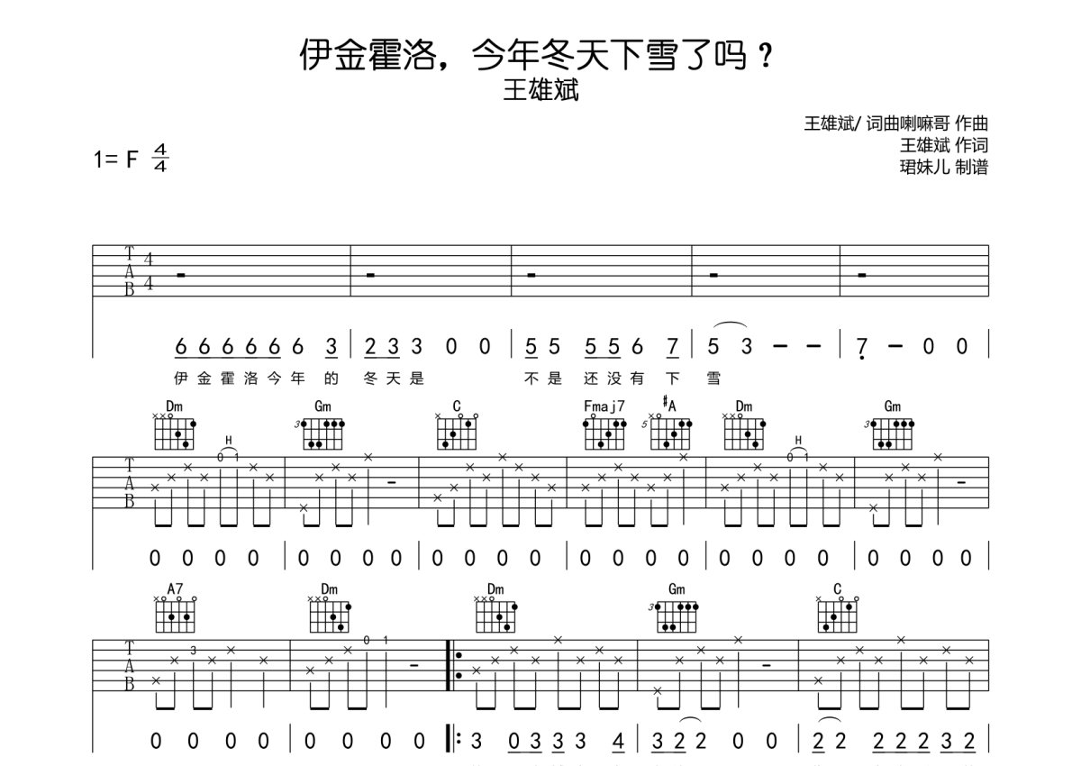 王雄斌《伊金霍洛,今年冬天下雪了吗?》吉他谱 - F调弹唱六线谱