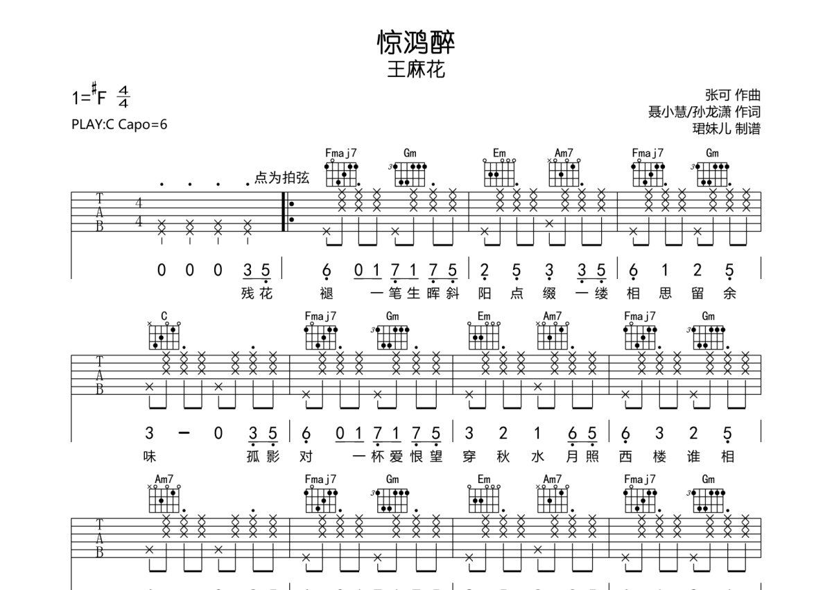 王麻花《惊鸿醉》吉他谱 - C调弹唱六线谱